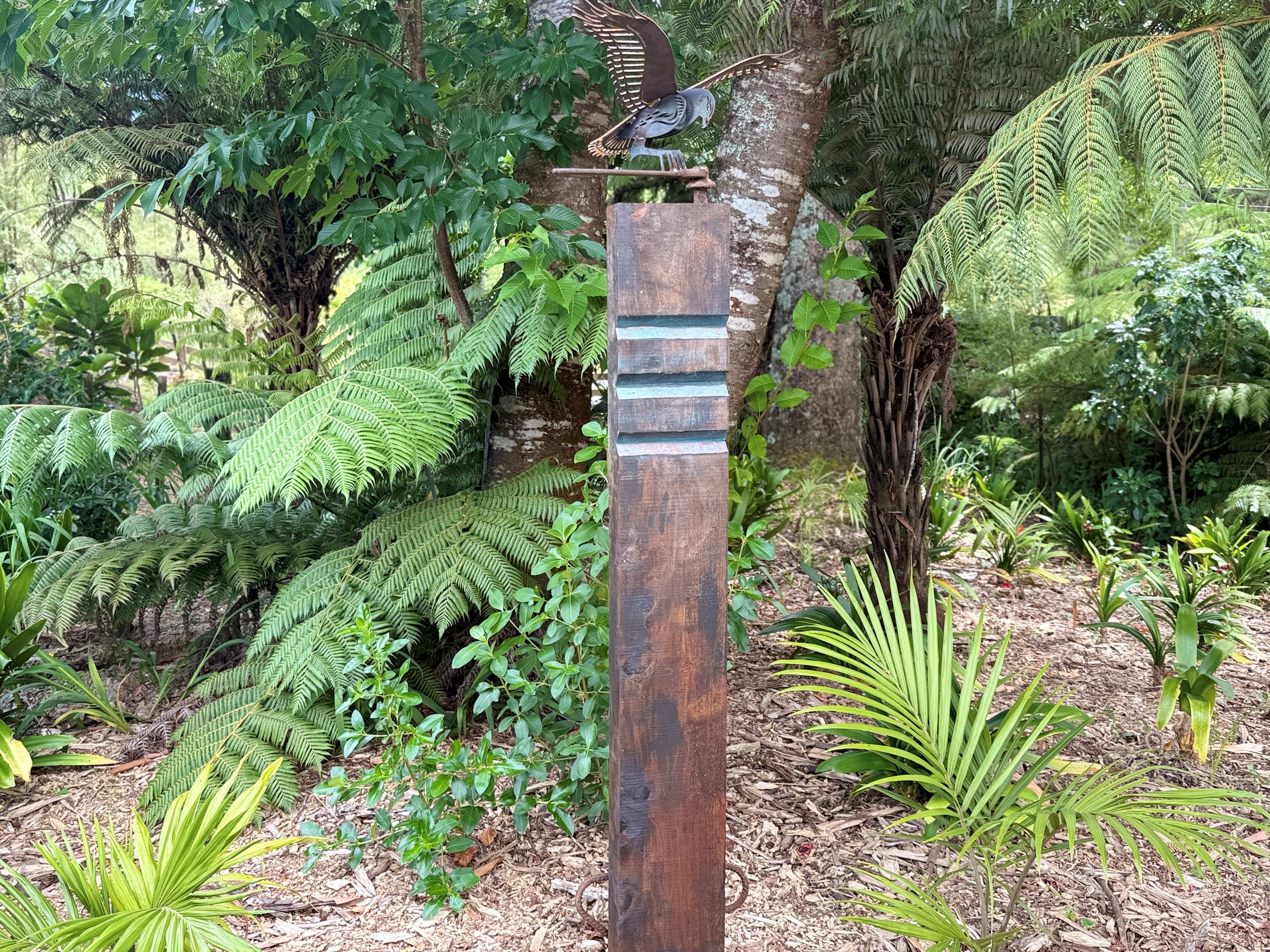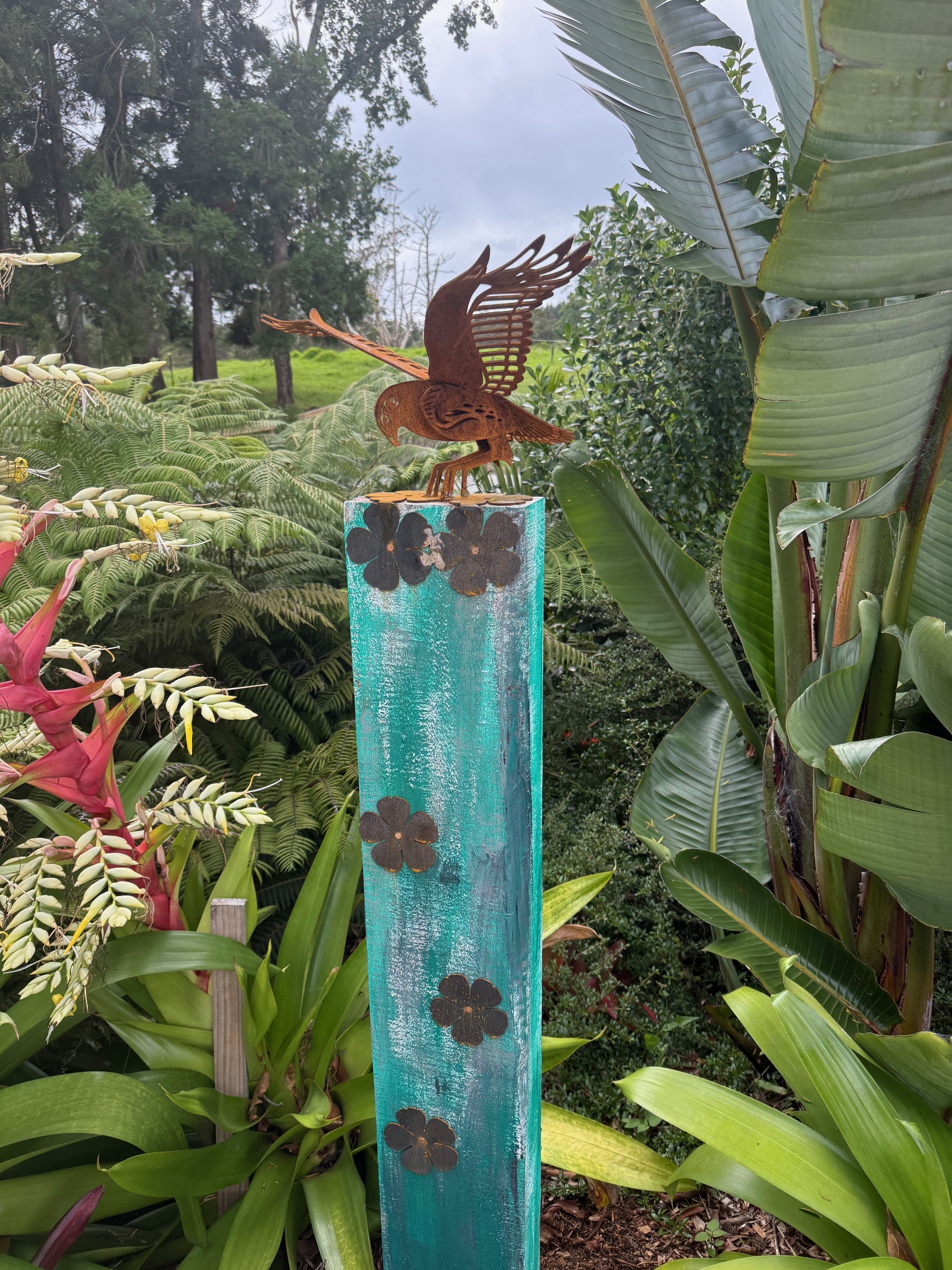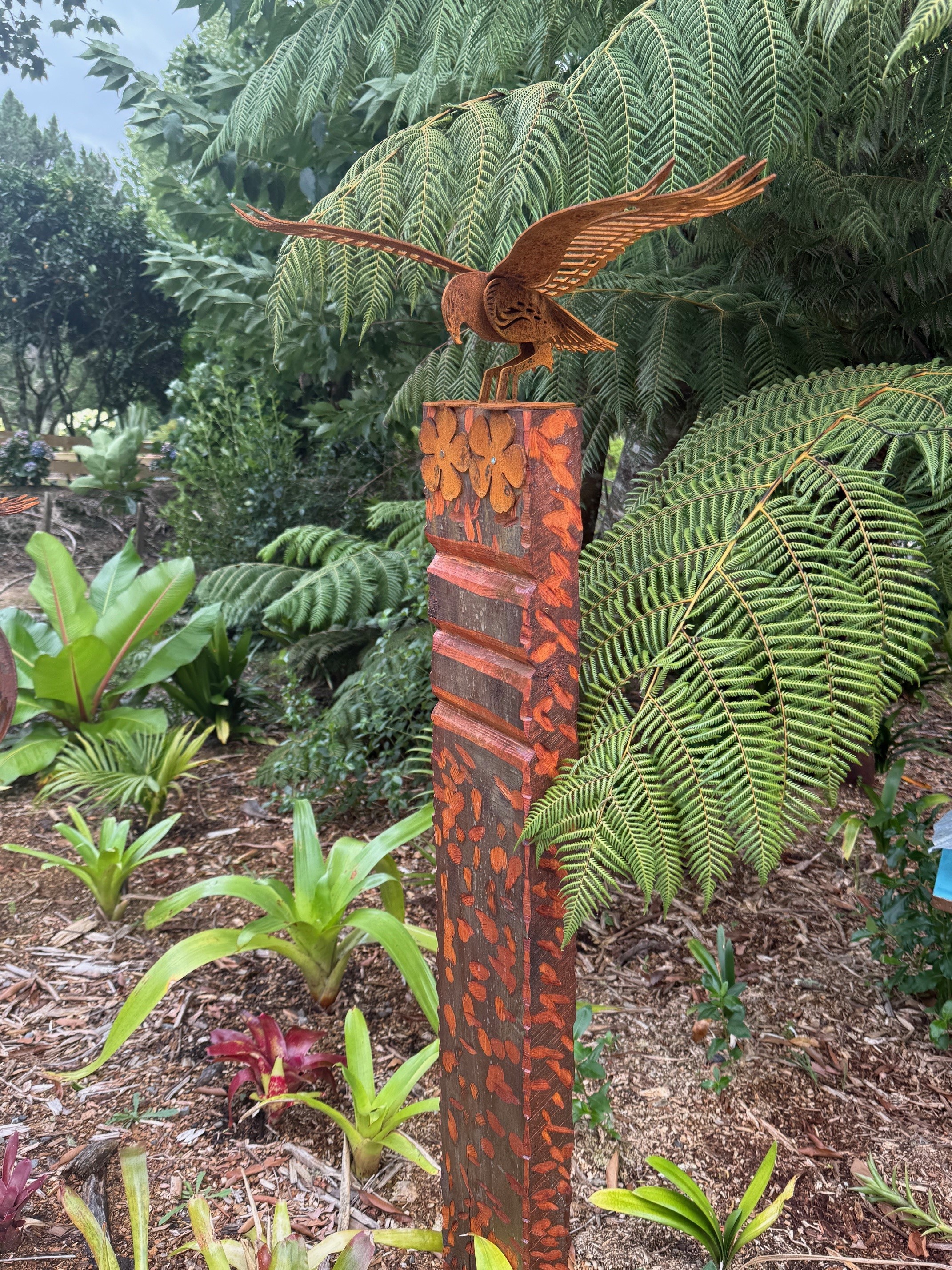 Kahu landing on the horse shoes, bands of copper on cedar post