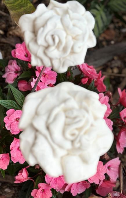 Hand made pottery roses, Wilma J Design, on a aluminum peg, look amazing in threes. Sold seperately