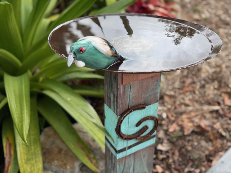 Loving this repurpose Plough Farrow for the Sparrow or Tui in the garden. Purposeful repurpose a bit of history right there with copper effect and old horse shoes. Unique, one of a kind, nothing like it.